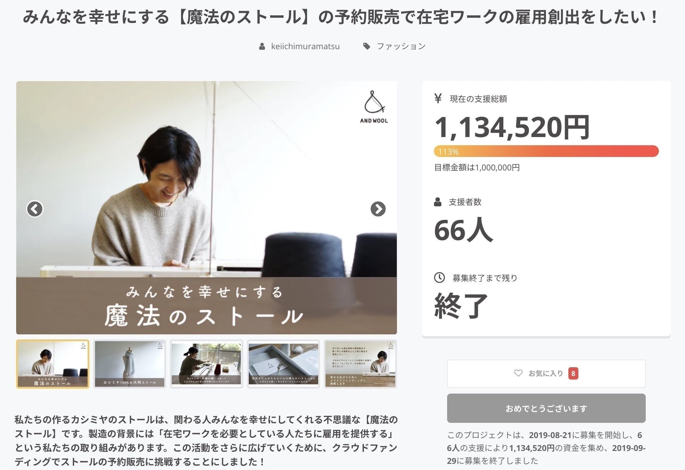 2021/06/25 12:00こんにちは、ファッションデザイナーの村松啓市です。いつも私たちの活動を応援してくださっている皆様、ありがとうございます。先月から挑戦を続けてきたクラウドファンディング「みんなを幸せにする【魔法のストール】で在宅ワークの雇用創出をしたい!2021」も、いよいよ残り4日になりました。本日は、残り数日となりましたクラウドファンディングについて、今の率直な気持ちを皆様にお伝えしたいと思い、この活動報告を書かせていただきました。今回の挑戦について今思うことは、「1つの活動内容で3回目は難しい」というのが正直な感想です。私たちの声が届く方たちにはすでに【魔法のストール】がお届けできている状況であったり、私自身、何度も大きな声で挑戦を掲げることには、やっぱり少し負い目を感じてしまいます。。。もしかしたら、クラウドファンディングで何度も挑戦する姿を見せることは、自分自身の信用貯金を引き出しているだけなのかもしれない、とも感じでいます。でも、自分たちが自信と責任をもって作っている製品だからこそ、声を大きく出してしっかりと届け、活動を続けていくべきだと、弱気になる自分に言い聞かせています。先日、私たちの製品製造を手伝ってくれているニット職人さんたちに改めて取材をしたり、アンケートをとったりして、お話を聞く機会を作りました。また、先週末は『ニット職人と逢える会』というイベントを、私たちの店舗兼アトリエで行いました(ご来店くださった皆様、本当にありがとうございました)。手を動かしてニット制作に携わってくれている方たちや、お客様、応援してくれている方たちから直接話を聞いて思うのは、「この活動をもっと世の中に広めていきたい」「もっといい環境に育てていきたい」ということでした。正直、まだまだたくさんの方の「想い」に助けられている部分が多い活動ですが、きっと、必要としている人は、制作する側にもお客様の中にもまだまだたくさんいるはずだと、常に感じています。クラウドファンディングは残り数日で、今回は目標を達成することができないかもしれませんが、私たちの活動はまだまだこれからですし、引き続き声を出して、手を動かして、足を使って、すばらしい製品を作りお届けしていきたいと思っています。よろしくお願い致します。ファッションデザイナー村松啓市※今回のクラウドファンディングは「All-in方式」で実施しています。目標金額を達成できなかった場合も、リターン品をお届けしますので、どうぞご安心ください。 もっと見る