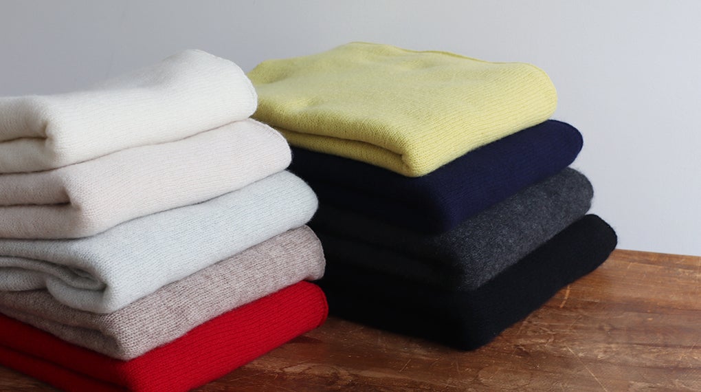 上質なホワイトカシミヤ(100%)を使用しています。カラーは、今回のクラウドファンディング限定色「ブルー」を含む、合計10色をご用意しました。
