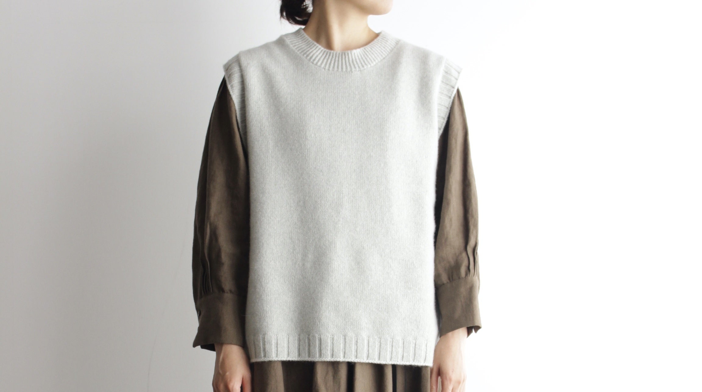 素材は【魔法のストール カシミヤ100%】と同じ、上質なホワイトカシミヤの糸を使用しています。軽くてあたたかい薄手のベストなので、シーズンを問わず快適に着ていただけます。