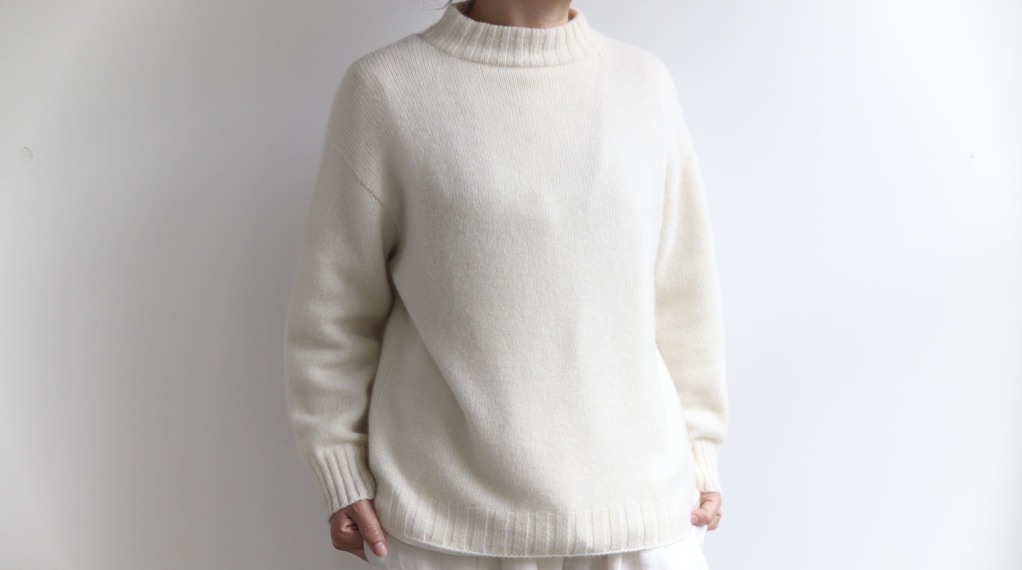 【魔法のストール カシミヤ100%】と同じ上質なホワイトカシミヤ100%の糸で作るセーターです。大変やわらかく肌触りもすばらしいセーターで、私たちが自信をもって皆様におすすめできる製品です。「手編み機」を使って、1枚1枚丁寧に編み上げてお届けします。ぜひ、この上質な着心地を一度皆様に味わっていただきたいです。