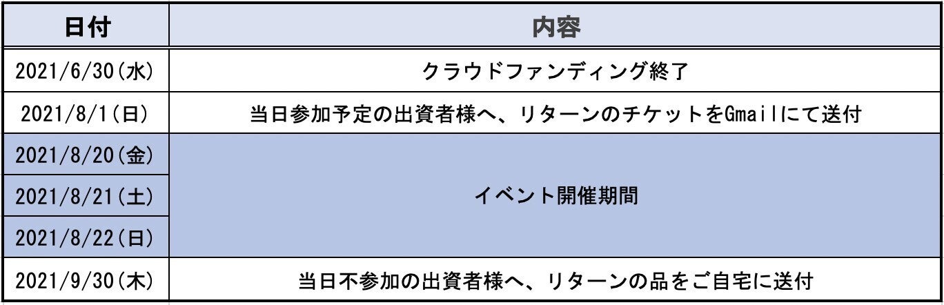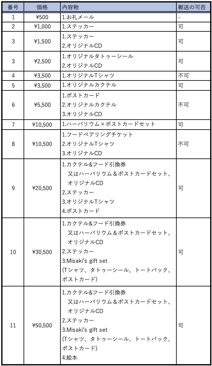 クラウドファンディングの実施に際して、下記内容のリターンを設定させていただきました。イベント当日に使用できるお得なチケットや、メンバーが製作したアイテムなど、多種多様に揃えました。金額の多寡は問いませんので、何卒ご検討をお願い申し上げます。詳細につきましては、「リターン」の各ページで記載をしております。注意事項や商品イメージ画像等はそちらでご確認下さい。