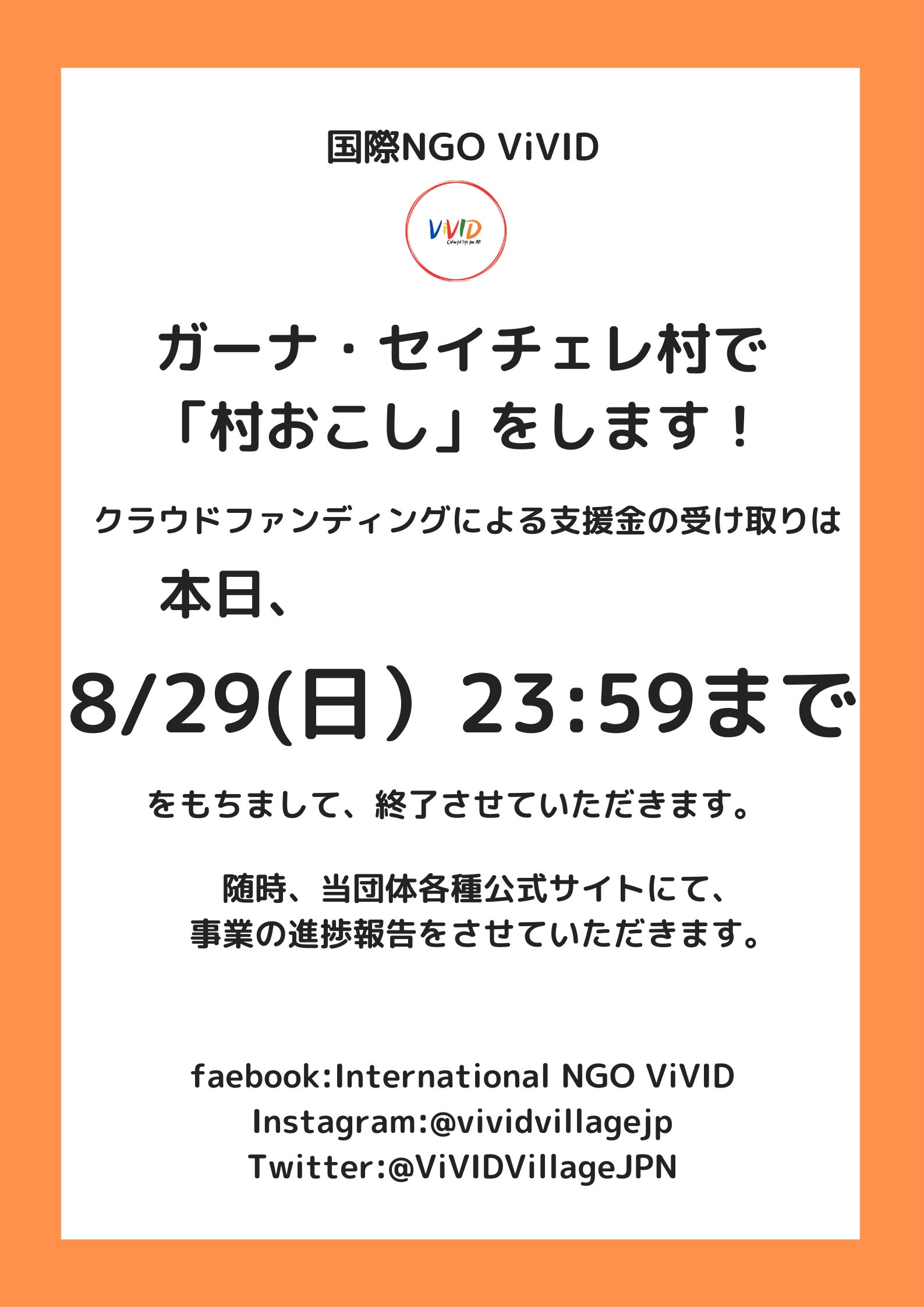 ガーナ共和国セイチェレ村「村おこし」事業のクラウドファンディング第2弾として実施させていただいた今回の「ガーナ・ セイチェレ村で『村おこし』をします!」ですが、8月29日(日)23:59を持ちまして終了させていただきます。支援者の方々の温かい思いを感じながら活動させていただいた2ヶ月間となりました。ありがとうございました!