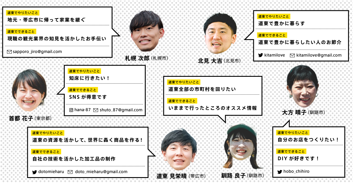 それぞれの地域で一人でできることに限界を感じていた私たちは、道東誘致大作戦というイベントをきっかけに、一緒にプロジェクトを実施し、一人ではできないことがチームでならできることや、「道東」という広域でなら、想いを共にする仲間やスキルと出会い、理想を実現していける可能性を感じています。