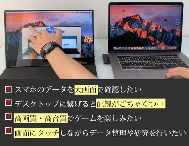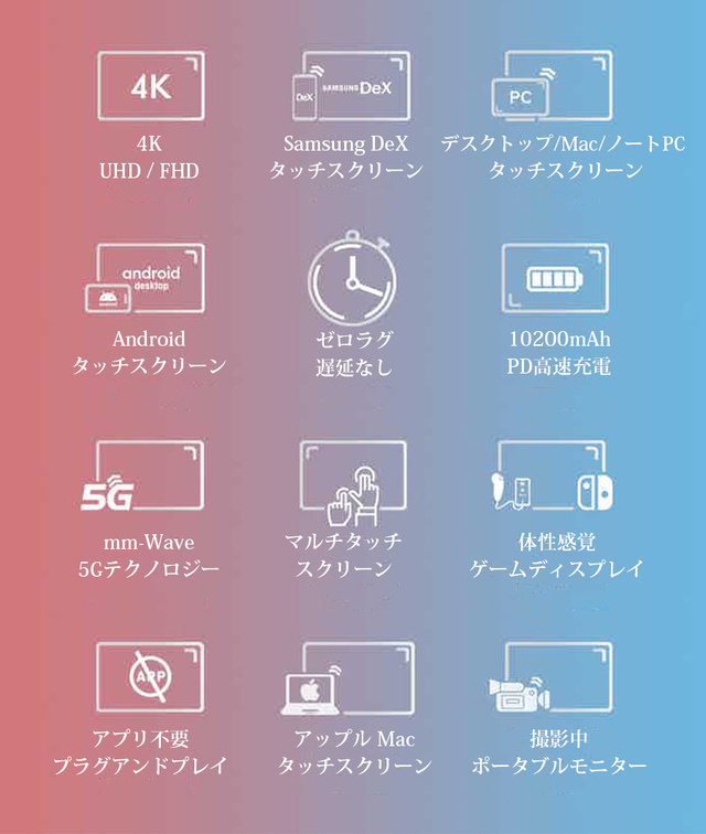 ワイヤレスタッチスクリーンディスプレイ、PC、スマートフォン等のデバイスの革新的な統合に努め、製品を手に取った皆さまがより快適な生活をおくれるよう願っております。