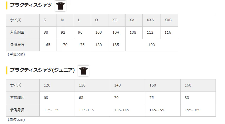 プラクティスシャツサイズ表