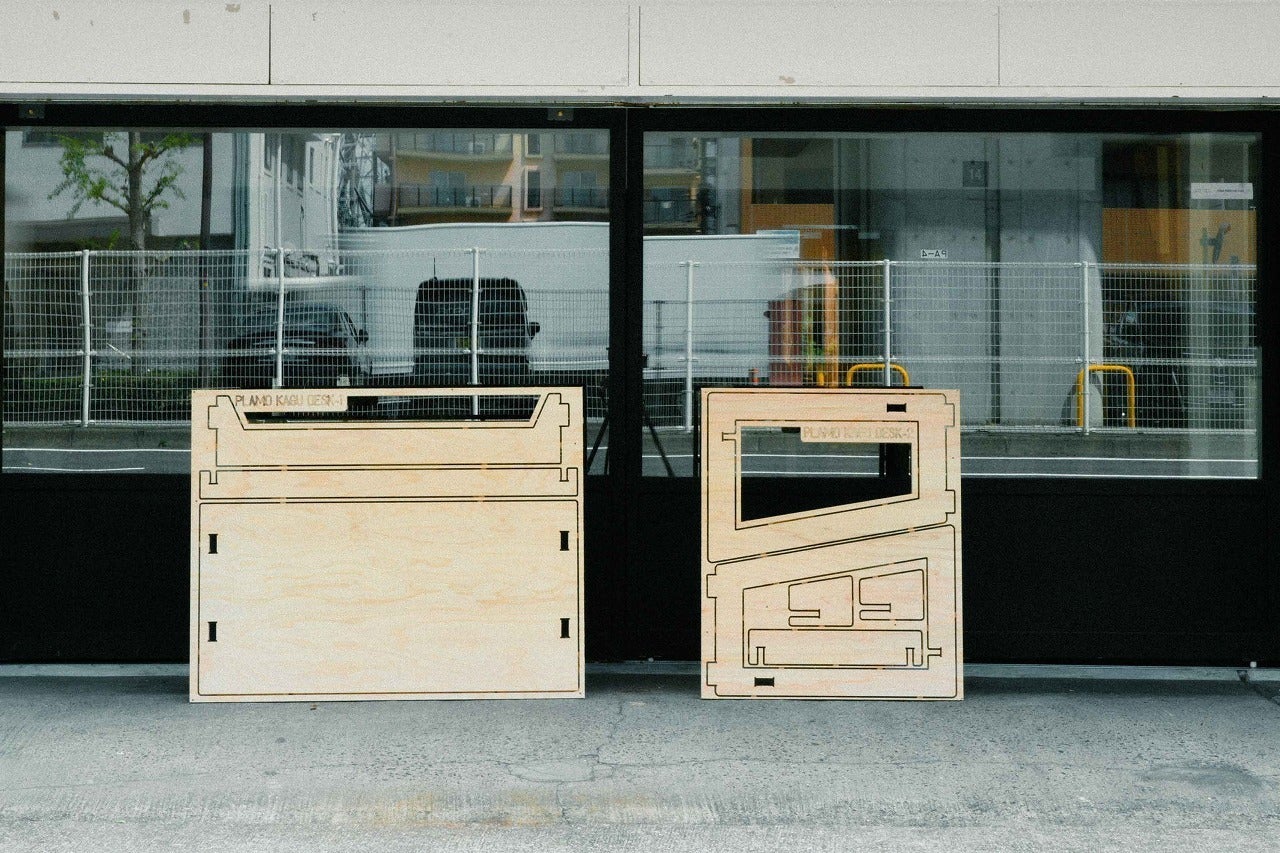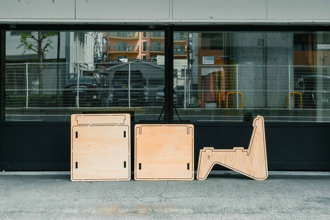 「プラモ家具3×6(サブロク)」は、左のような板状で届きます。こちらは組み立てると右のミニデスクとスツールになります。お子様の勉強机や、テレワーク用にいかがでしょうか?