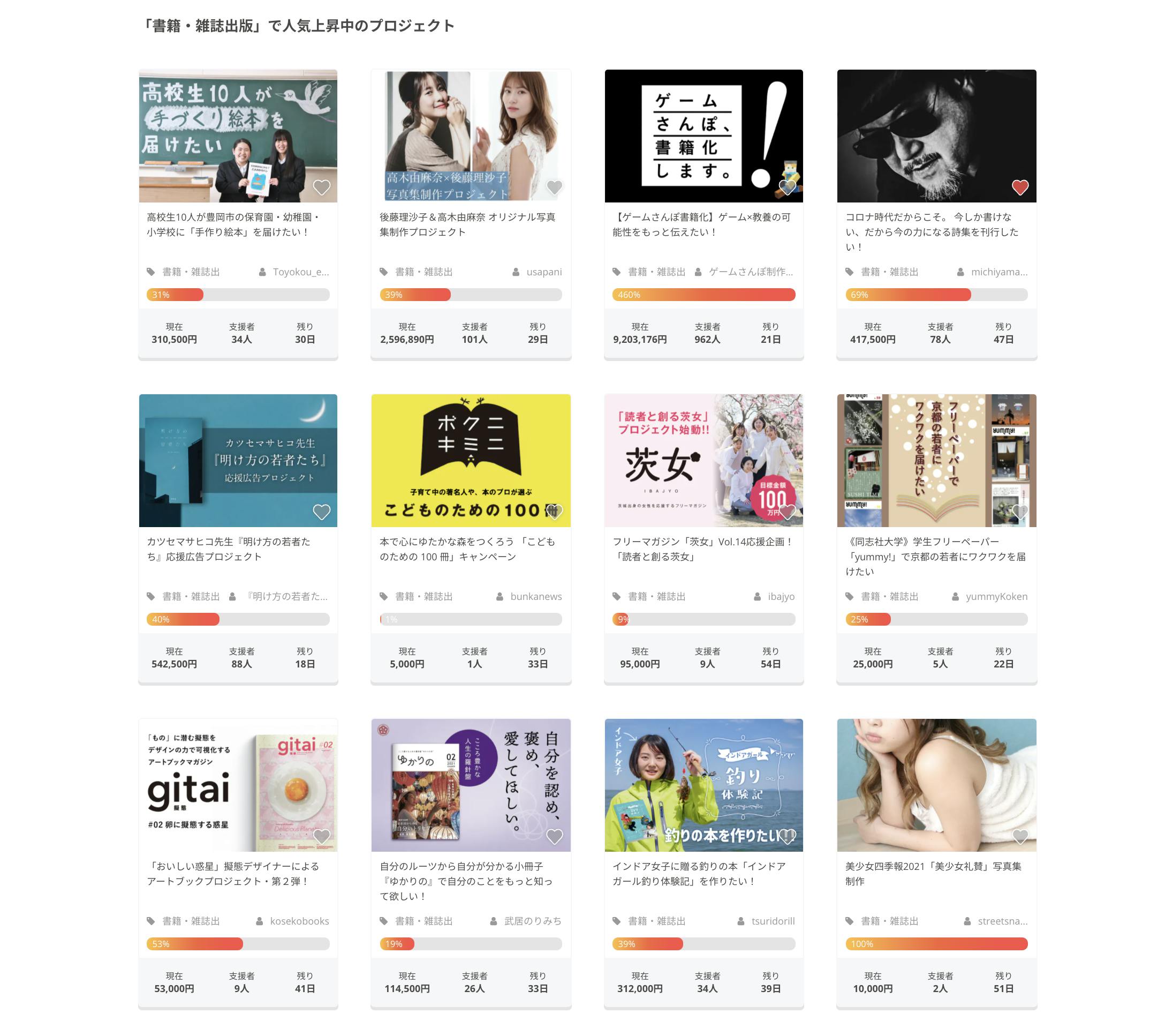 数多い「書籍・雑誌出版」で人気上昇中のプロジェクトカテゴリーで、
