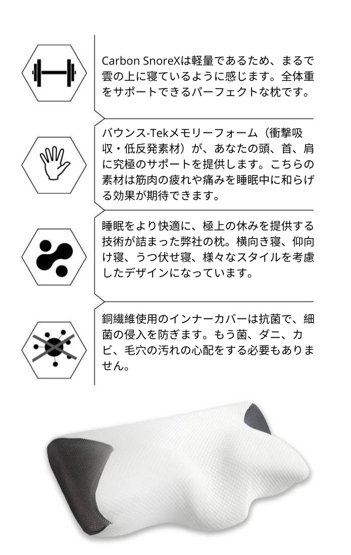 Carbon SnoreX™は今までにない8つの機能を備えた枕です。竹炭、グラフェン・銅繊維を使用し、カビやアレルゲンから睡眠を守ります。二つの腕置き及び冷却枕ケースにより、枕に熱がこもらずに一晩中涼しく快適に寝ることができます。