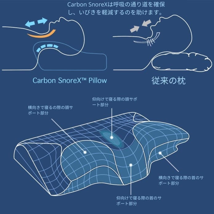 Carbon SnoreX™は今までにない8つの機能を備えた枕です。竹炭、グラフェン・銅繊維を使用し、カビやアレルゲンから睡眠を守ります。二つの腕置き及び冷却枕ケースにより、枕に熱がこもらずに一晩中涼しく快適に寝ることができます。
