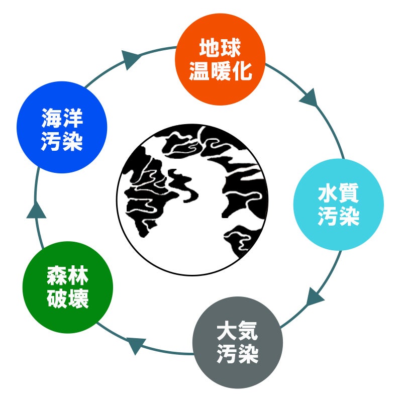 地球温暖化、水質汚染、大気汚染、森林破壊、海洋汚染