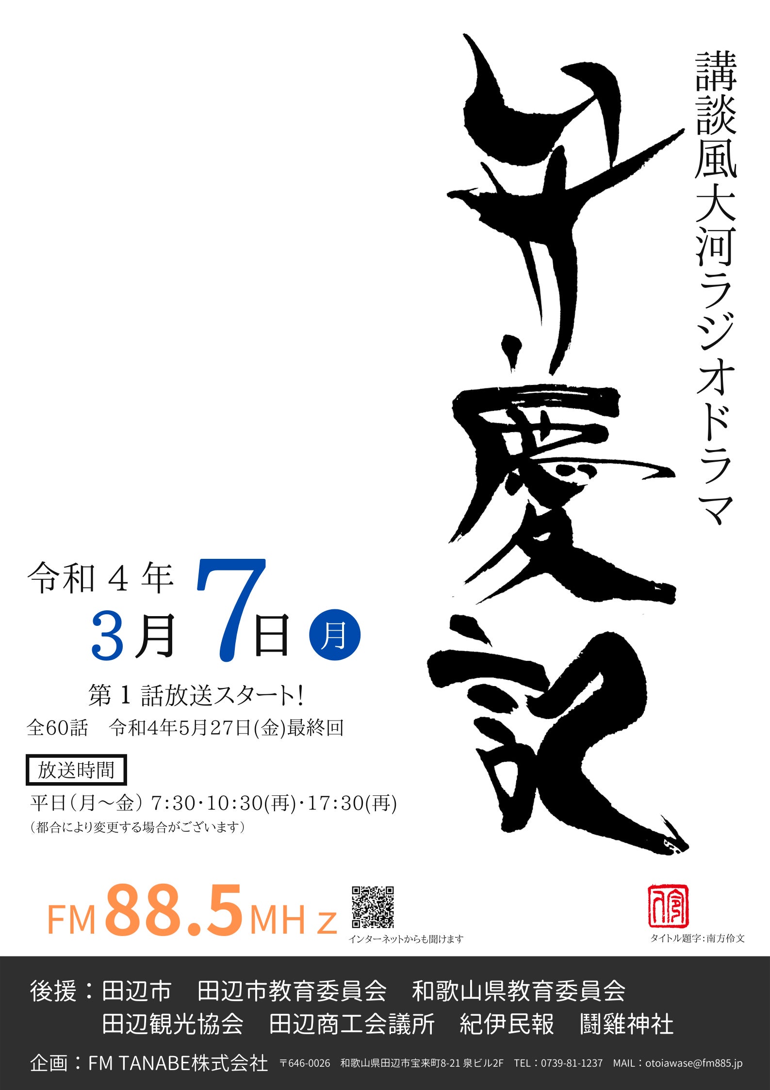 そのような状況だからこそ、ラジオを通して田辺市の皆さまの力になりたいと、今回のラジオドラマを企画しました。苦難の時代を生き抜いた、怪力無双・一騎当千の豪傑、武蔵坊弁慶の力を借りて、楽しく聞けて歴史を学び、少しだけ生きることに前向きになれる、そんなラジオドラマを制作したいと思います。