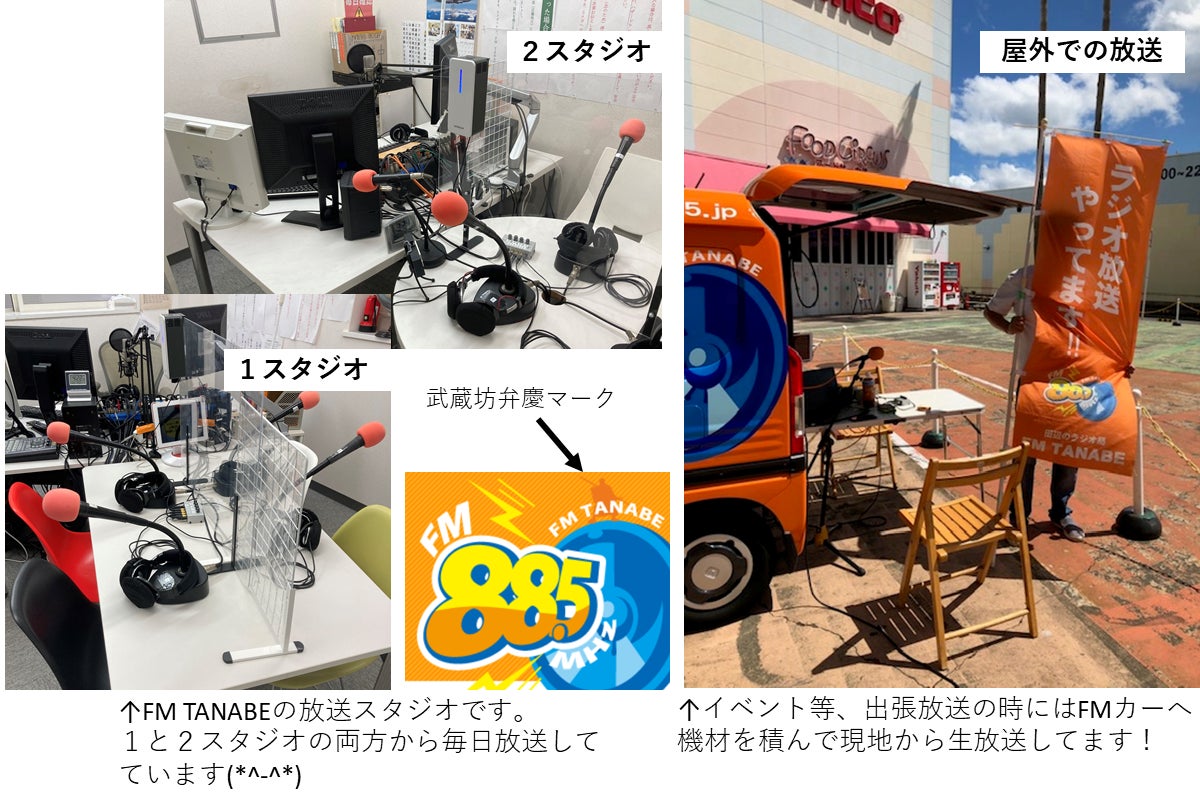 FM TANABEは、局のロゴマークに武蔵坊弁慶のマークがデザインされている程、弁慶への思い入れが強いラジオ局です。所属のパーソナリティの中には毎年、弁慶祭で行われる演劇弁慶伝説に出演されている方も多数おられます。毎年開催される弁慶祭ではラジオ放送でイベントの様子や雰囲気を現地から生中継でお伝えしてます。ほかにも、田辺・弁慶映画祭の特別番組を映画の上映会場からお届けしたり等、弁慶を冠する色々なイベントを放送でお伝えしています。
