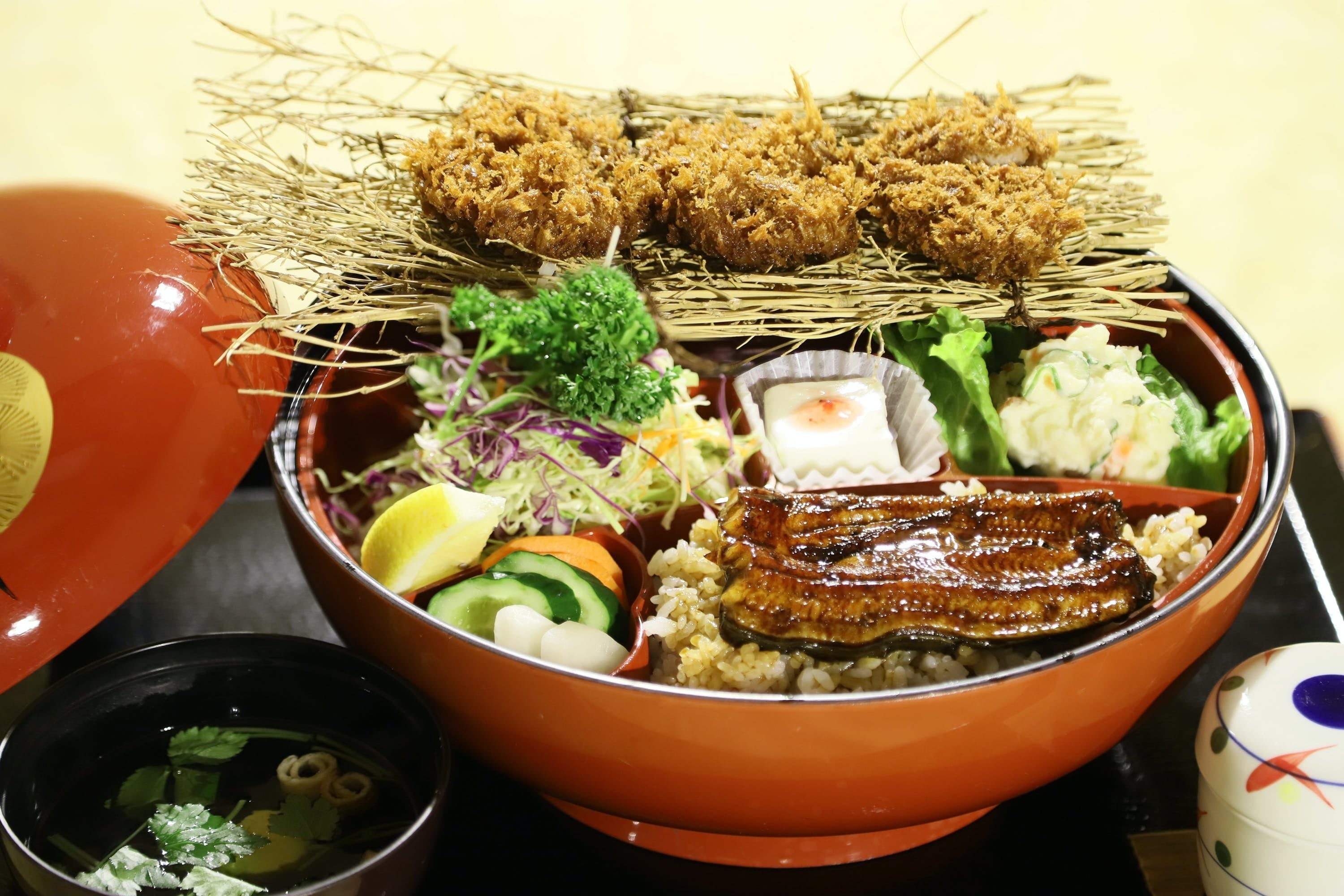 30㎝ほどの大きなお椀にヒレカツとうな重がセットになったメニューです。
