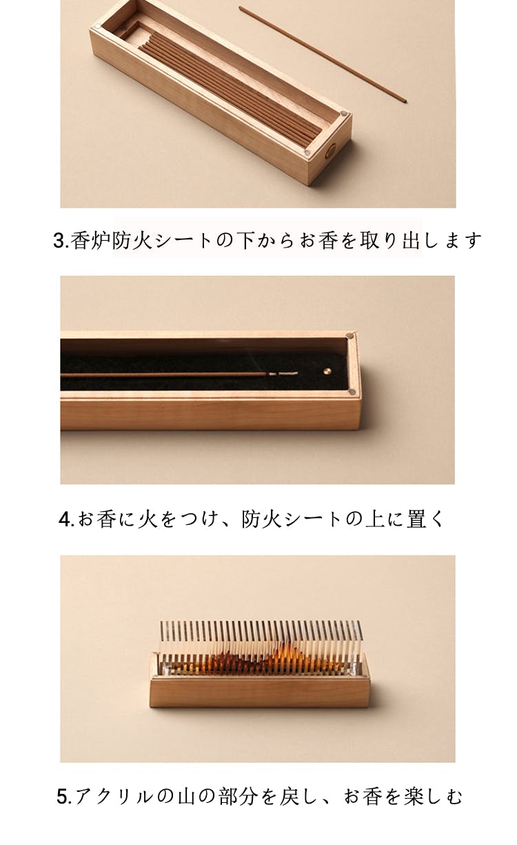お香は基本「火」を利用して、香りを揮発させることで楽しみます。原始時代もこの原理を利用して、お香を楽しんでいたのではないかと考えられてます。「お香」は人間が原始的な生活をしていたころからあった、とても古い「文化」。古い「文化」と現代デザインを融合させ、唯一無二の「隠山」が誕生しました。