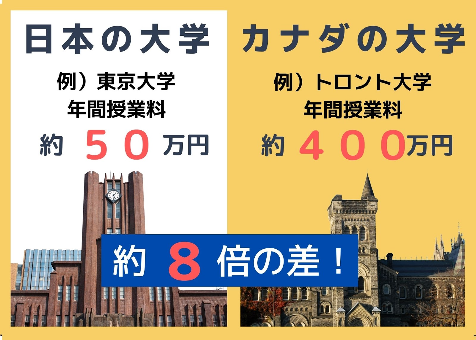 例をあげますと、日本の東京大学は1年間の授業料が約50万円であるのに対し、カナダのトロント大学では1年間で約400万円と日本の大学の約8倍ほどもかかります。