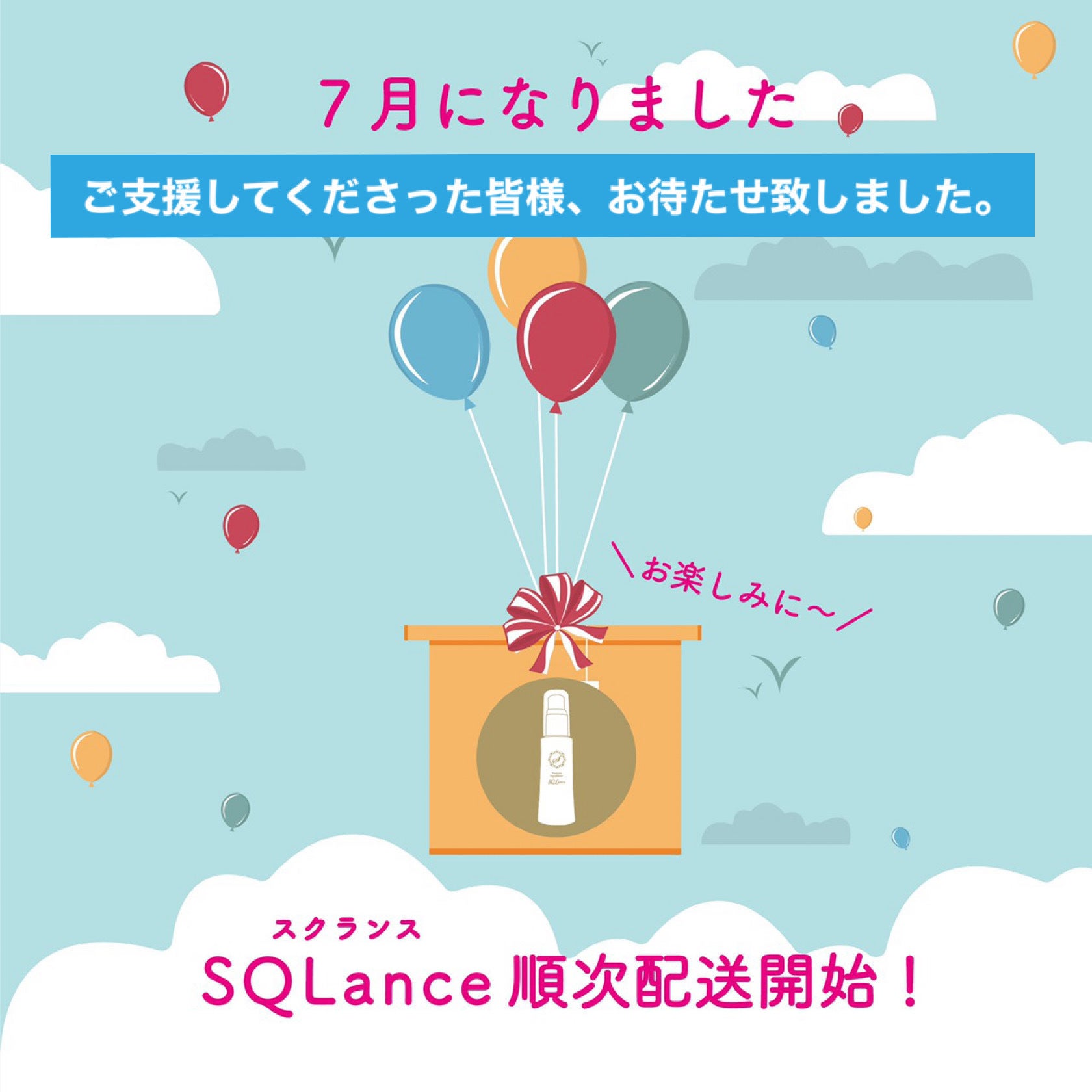 おはようございます。この度はご支援いただきまして誠にありがとうございます。ご支援されたリターンを昨日(7/1)発送させていただきました。SQLanceがお手元に届くまで、今しばらくお待ちくださいませ。なお、7/7(水)までに未着の場合はご連絡ください。【お願い】お写真とともにinstagramまたはfacebookに「#スクワランハウス」をつけてご紹介いただけましたら是非ご連絡ください。お一人様につき小分け容器1セット(10ml×3本)を御礼で送らせていただきます。ご使用感のご感想をお聞かせ下さるとうれしいです。できればBefor&Afterなど、お写真も添えていただけましたらより参考にさせていただきます。改めて、ご支援いただきまして誠にありがとうございます。今後とも、どうぞよろしくお願いいたします。株式会社スクワランハウス