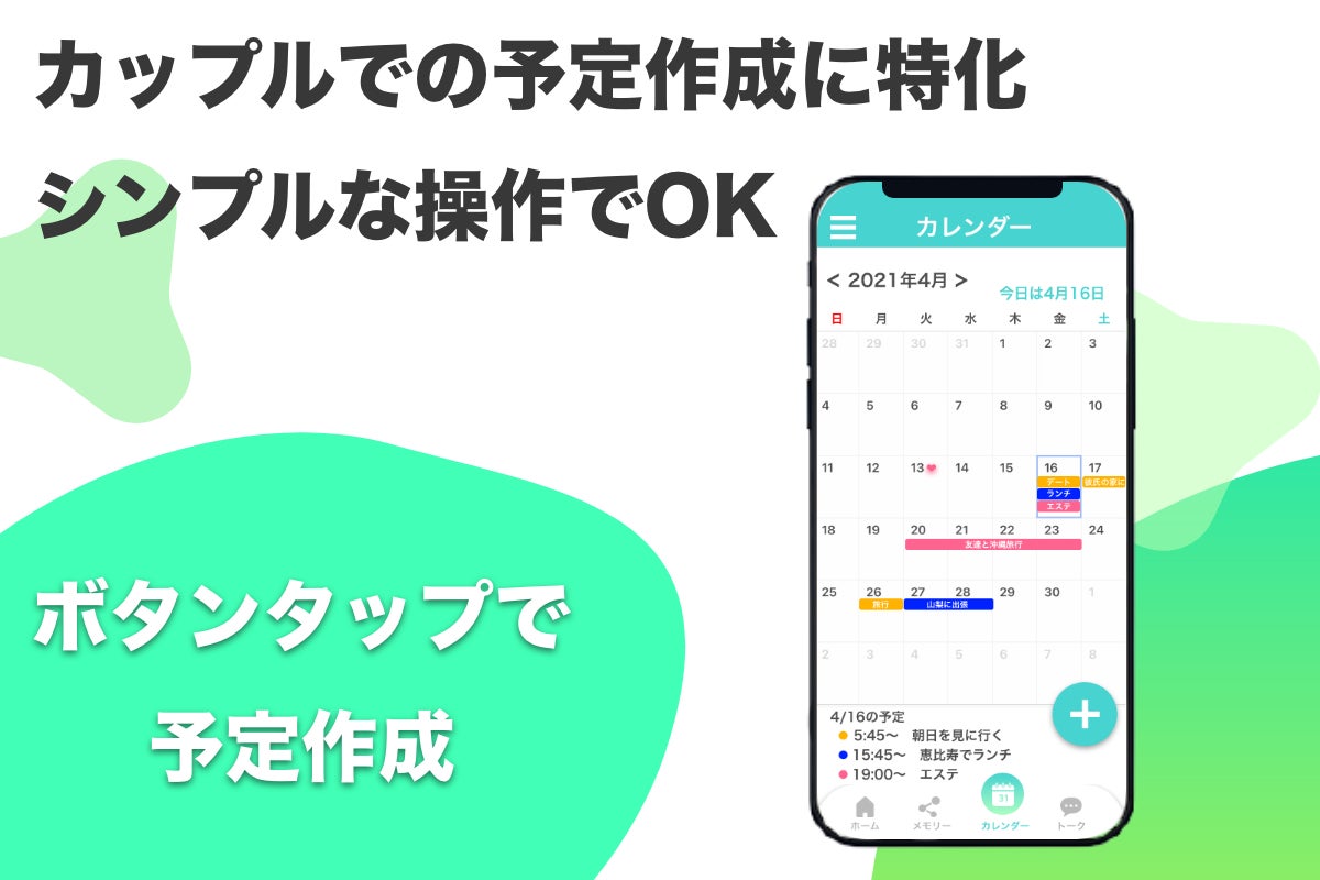(男性が青色 女性がピンク色 2人の予定はオレンジ色 と視覚でその日のスケジュールを確認可能)