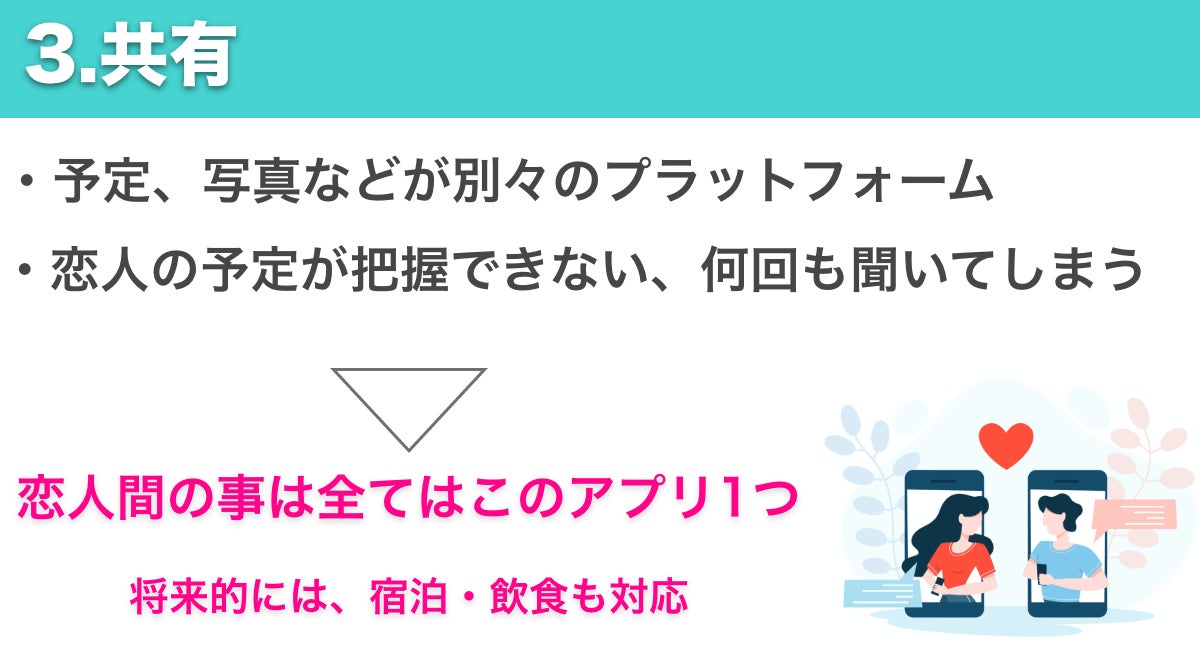 市場には既にカップルで使用できるアプリケーションはいくつか存在します。しかしそれらの多くは記念日のリマインダー機能に特化していたり写真共有機能に特化していたりと、