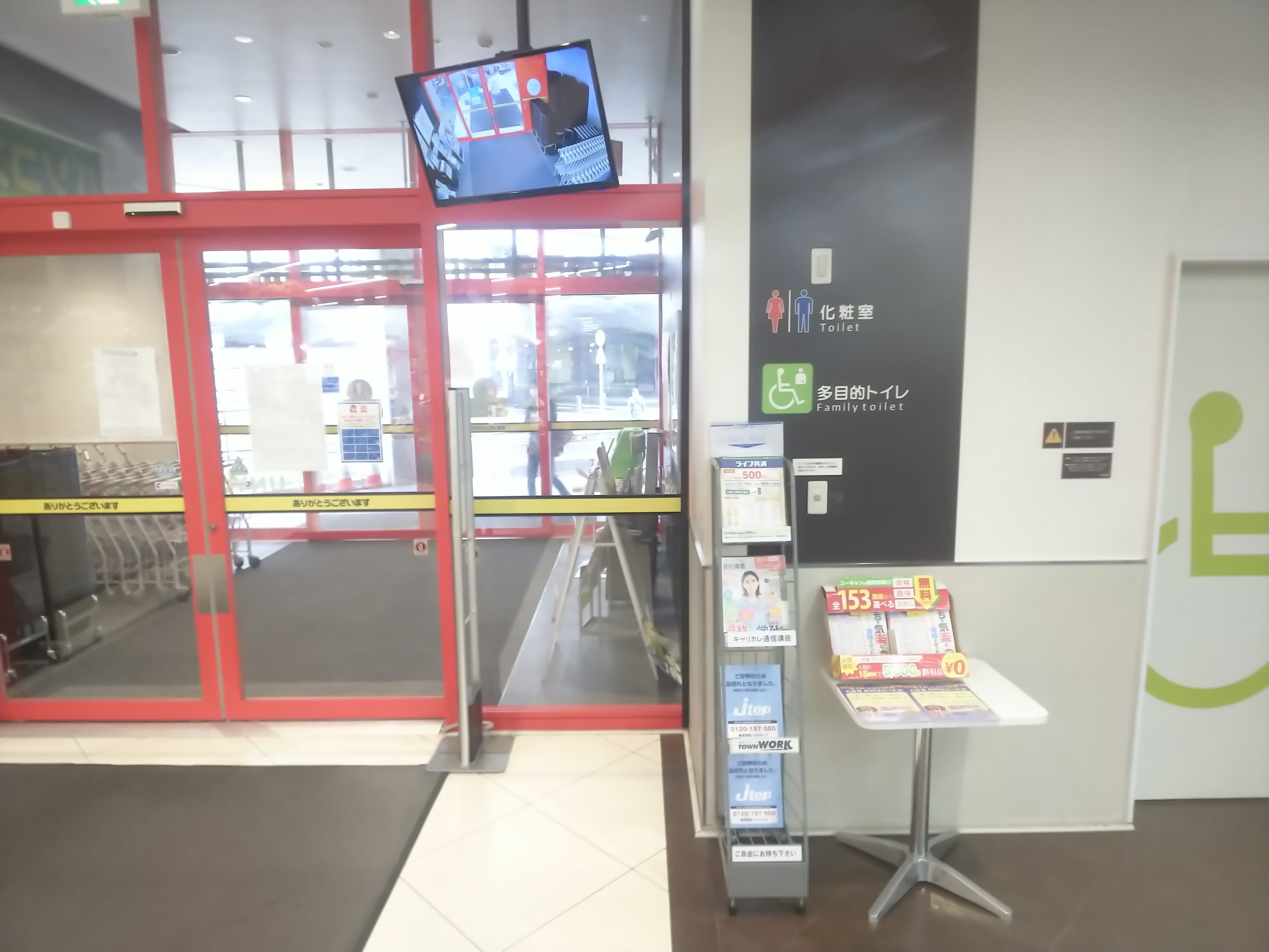 1階の【MEGAドンキ】さんの野菜売り場の裏側に休憩スペースがあります。そこの壁面にチラシを掲示、壁際のテーブルにチラシを置かせていただきました。