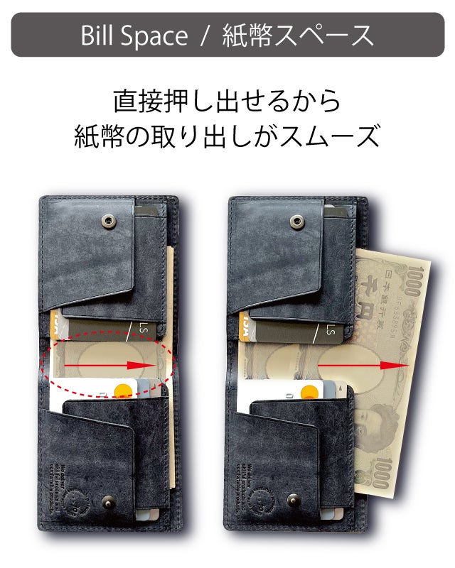 紙幣や領収書、レシートなどを折らずに収納が可能。紙幣を直接押し出せる構造のため、取り出しがスムーズ。