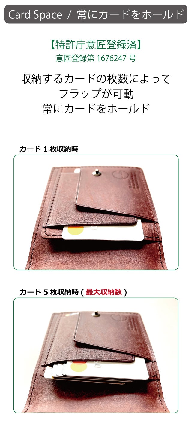 カードをホールドする2枚のフラップが可動する独自設計により、カードの枚数に左右される事なく常にカードをホールドします。<意匠登録第676247号>