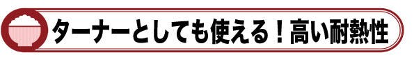 一般的なキッチンツールに使われるナイロン樹脂の耐熱温度が140℃であるのに対し、フッ素樹脂の耐熱温度は260℃と極めて高いため、しゃもじとしてだけでなく、“ターナー”としてもご利用いただけます。