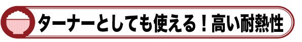 一般的なキッチンツールに使われるナイロン樹脂の耐熱温度が140℃であるのに対し、フッ素樹脂の耐熱温度は260℃と極めて高いため、しゃもじとしてだけでなく、“ターナー”としてもご利用いただけます。