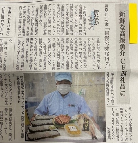 「新鮮な高級魚介CF返礼品に」という見出しで、「目利きや神経締めの技術は一流シェフからも評価されている。鮮度にこだわった自慢の味を届ける」という川村社長のコメントも載っていました。写真は1万円のリターンがカラーで紹介されています。