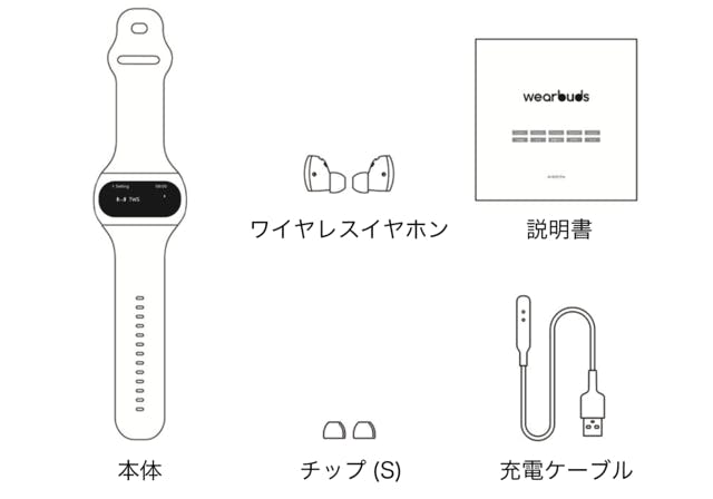 付属品:スマートウォッチ本体(ショートベルト)、ワイヤレスイヤホン、チップ(S)、充電ケーブル、説明書