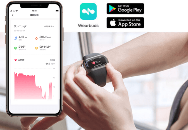 専用アプリ「Wearbuds」をダウンロードすれば、Wearbuds Proとスマートフォンを連動させて電話の着信やショートメッセージ、各アプリの通知などをディスプレイで確認できます。