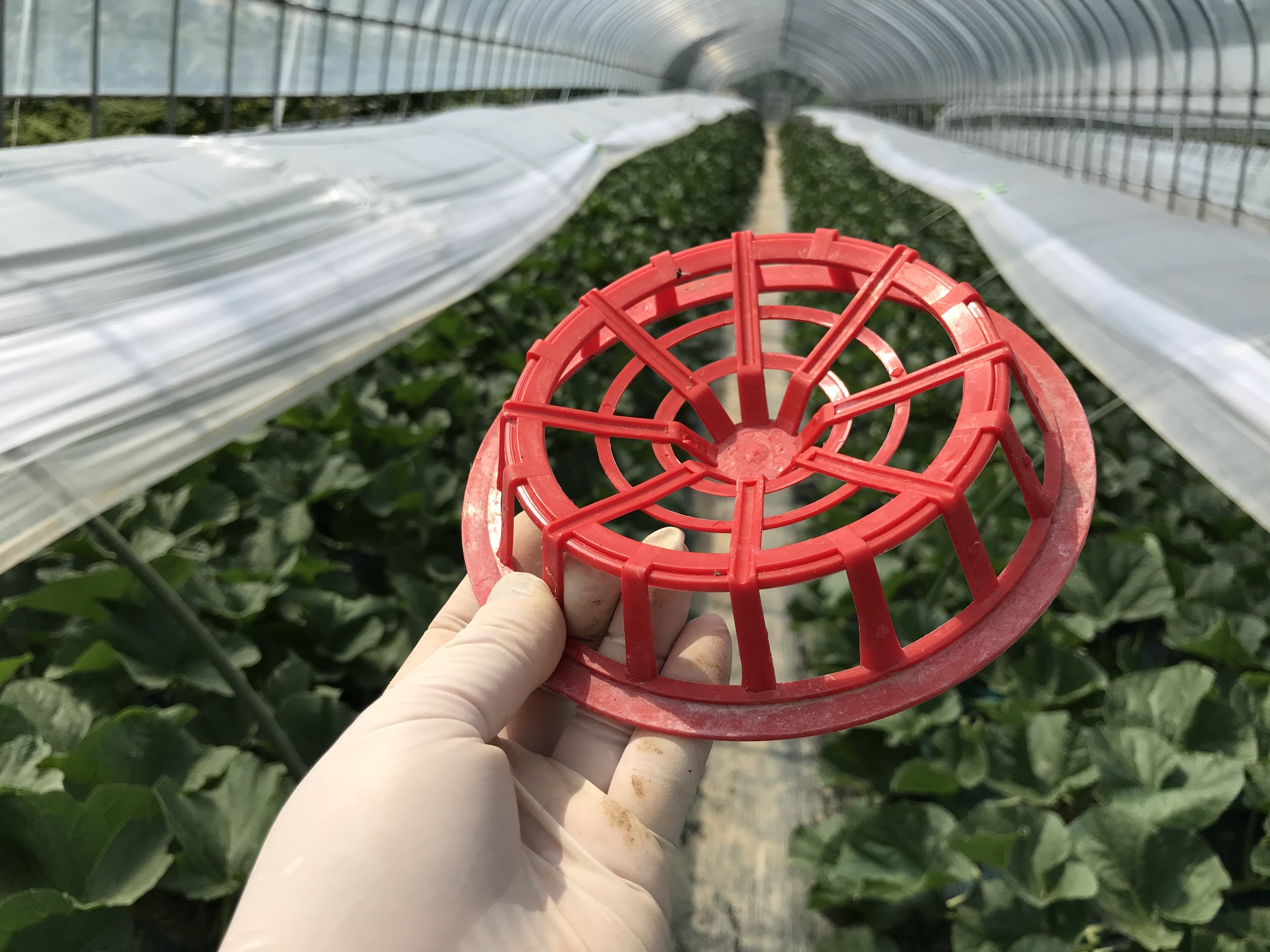 この日はメロンの皿敷き作業でした!メロンの実が大きくなってくると、地面に接する部分に水分があたって傷んできてしまいます。通気性を良くし、メロンの変色を防ぐために、この網目状の通称「お皿」をメロンの実の下に敷いていきます。