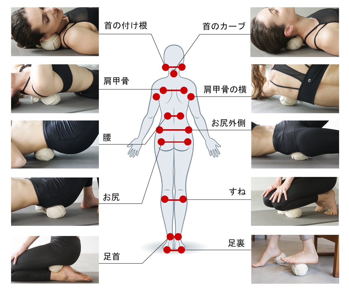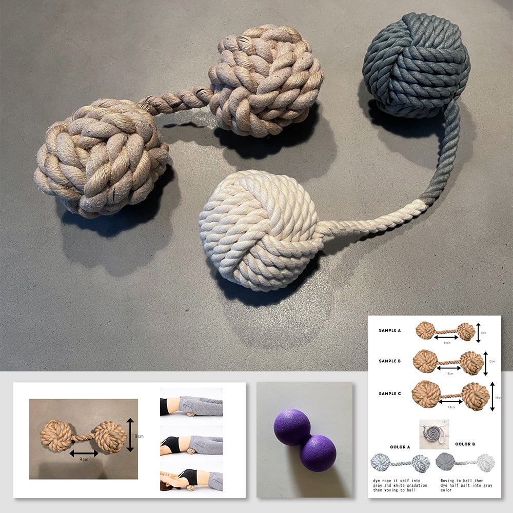 首のような狭い場所も、腰やお尻のような広い場所も一度にピンポイントでケアできるよう、二個のボールを約25㎝のロープで繋いだ設計になっています。他社のマッサージボールはボール同士の距離が変えられないし、マッサージローラーだと、当てたくない場所にも当たって痛いのがネックでした。安心して体重をかけられて、ピンポイントで効いてくれるように、このデザインを採用しています。