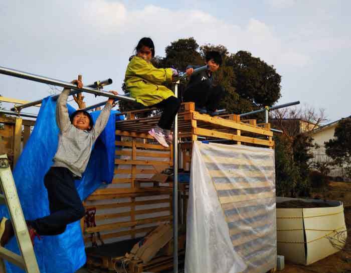 体育館約3個分とかなり広い土地で、息子やその友達を連れてくると、作りかけの小屋によじ登っては飛び降りたり、切り出した竹でチャンバラごっこをしたり、落とし穴を掘ったり――。重労働の腐葉土を運ぶ作業も手伝ってくれ、作業をしては遊び、遊んでは作業してといった感じで、暗くなるまで遊んでいました。