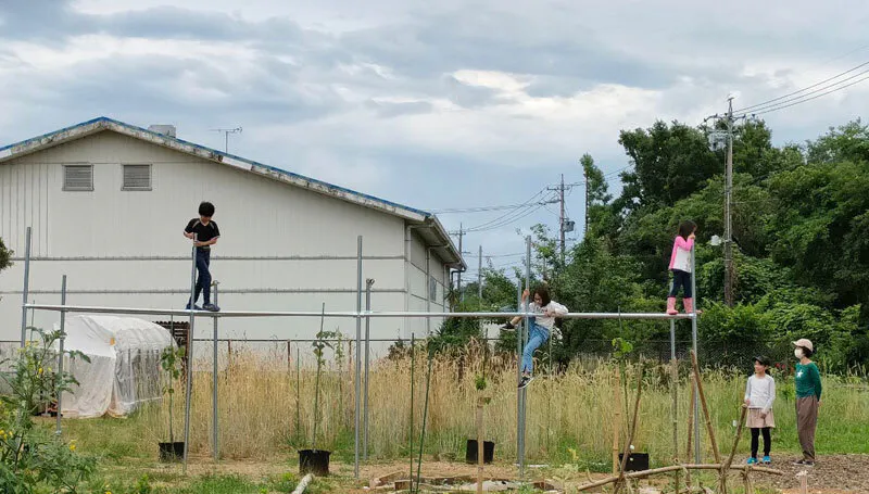 表紙の写真:ただいま「アートガーデンすずか」では、ぶどう棚を作っているところです。単管で骨組みを作っただけの状態ですが、早速小学生たちが登っていました♪