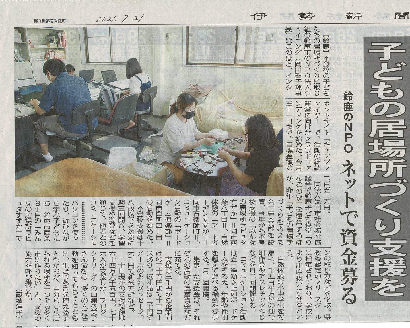 7月21日の『伊勢新聞』に、当団体が取り組んでいる居場所づくりの活動紹介とともに、クラウドファンディングについての記事が掲載されました!