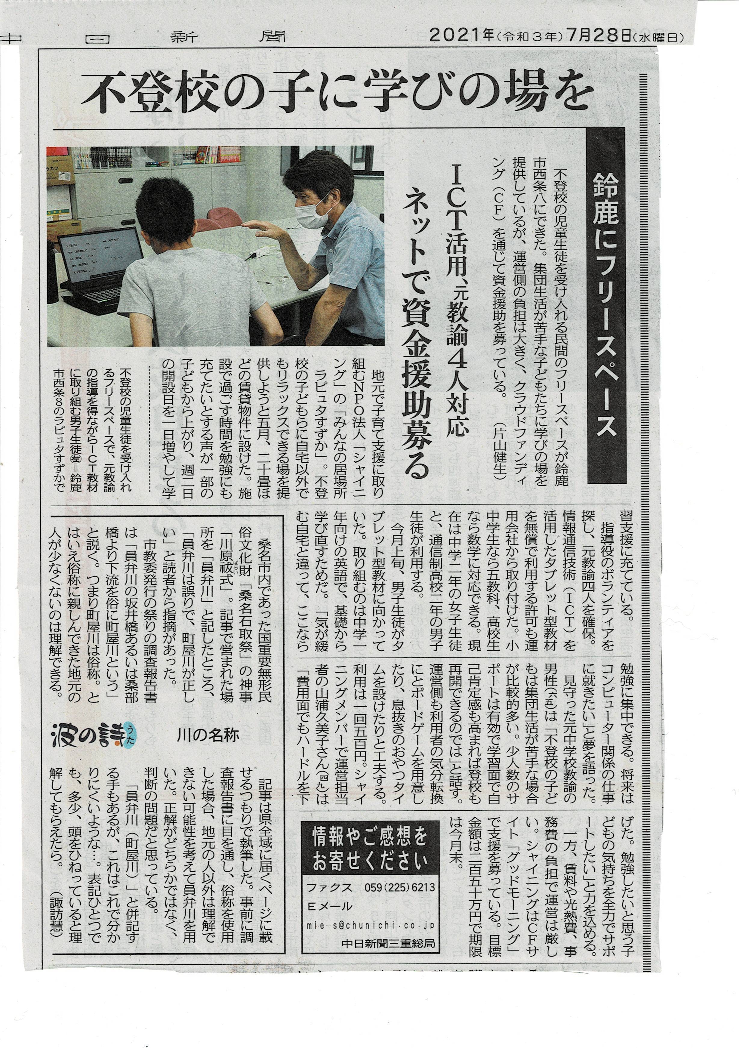 昨日は地元の『中日新聞』に、不登校支援事業「みんなの居場所 ラピュタすずか」での学習支援について掲載していただきました。