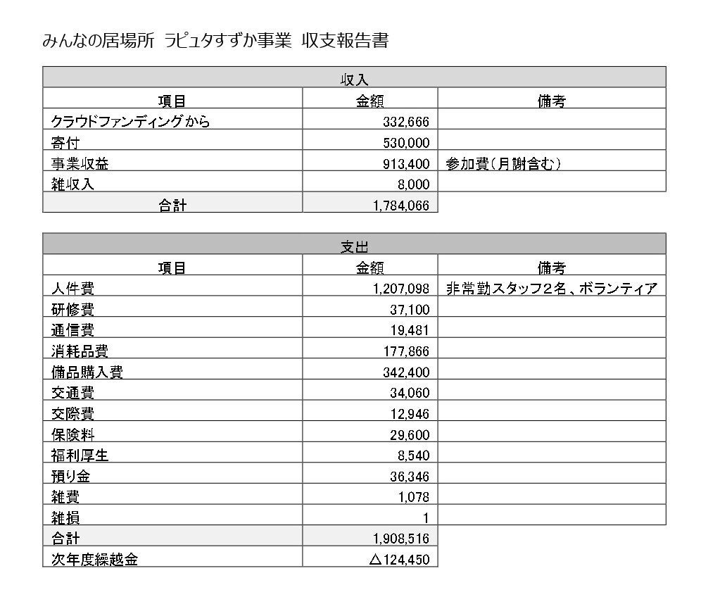クラウドファンディングとご寄付でいただいた支援金から、経費を引いた758,144円を、不登校の子どもたちの居場所づくり事業「みんなの居場所 ラピュタすずか」、子どもの自然体験活動「“遊べる畑”づくりプロジェクト」「若者応援基金」に上記のように振り分けさせていただきました。