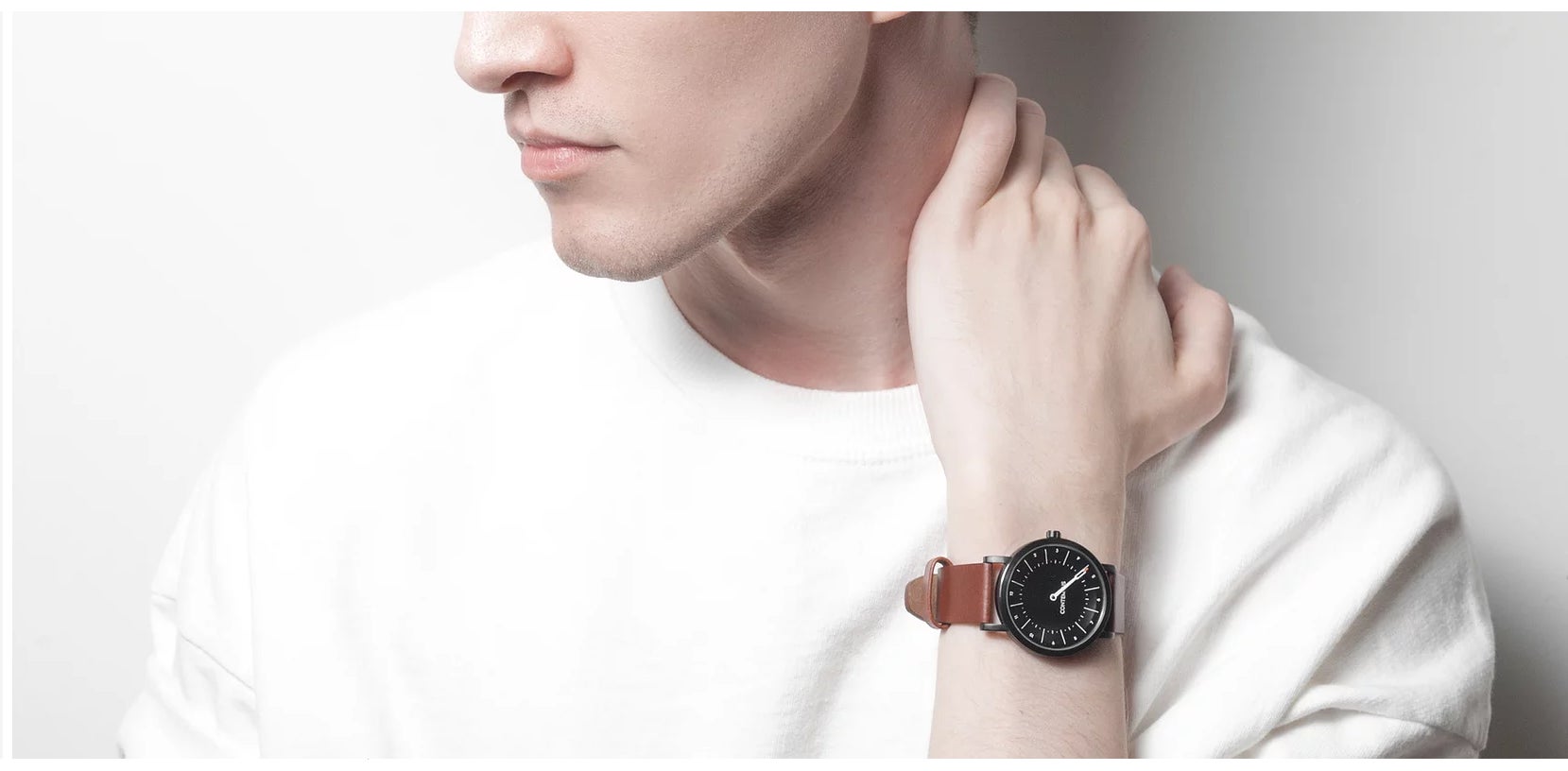 スタイリッシュなモノクロ配色の文字盤とアッシュレザーバンド