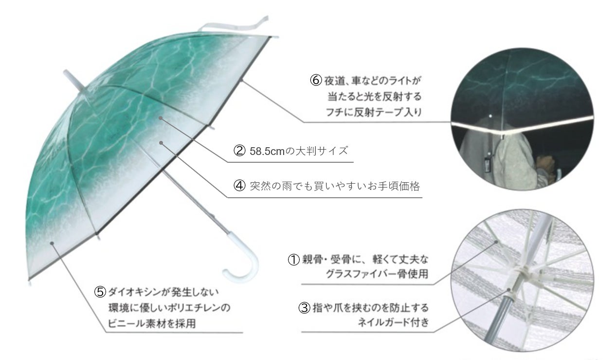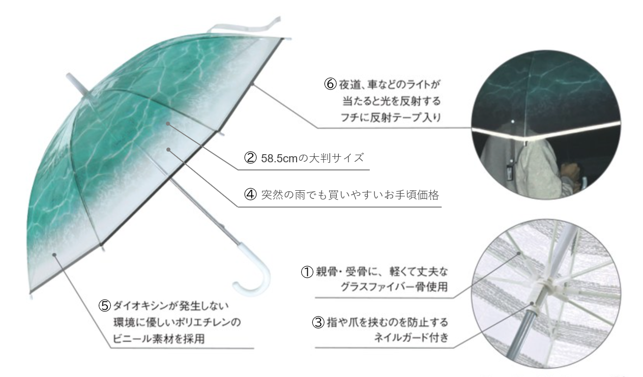 『ハッピークリアアンブレラ』が選ばれているのは、豊富なデザインもさることながら、その機能性の高さから。まずは『ハッピークリアアンブレラ』の6つの特長について、ひとつずつご紹介します。