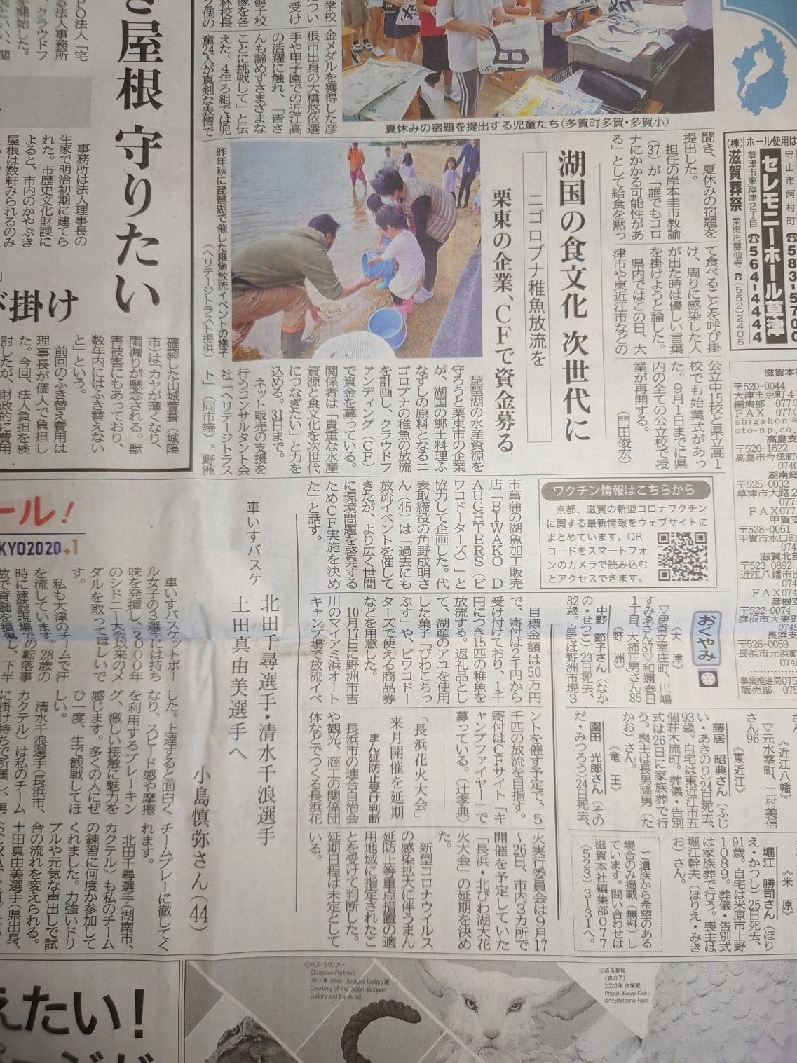 2021/10/17 12:09皆様からご支援いただきましたニゴロブナ放流プロジェクトですが、本日10/17 放流放流完了いたしました。あいにくの雨の中ではありましたが、今回合計で1000匹のニゴロブナを琵琶湖にお放流することができました。大きく成長してくれることを祈ります。皆様のご支援ありがとうございました。 もっと見る8/26京都新聞朝刊掲載