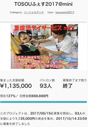 2017/10/15 23:3630日間のプロジェクトは無事に終了しました!! 9月15日に始まったTOSOUふぇす2017@mini★ 30日で888888縁の目標を掲げ、 集まったご支援総額はなんと 1135000縁!! 93名の方にご支援をいただきました!! みなさんのおかげでプロジェクトを達成することができました!! 本当にありがとうございました!!!! あっと言う間の30日間でしたが、 ペイントイベントの準備や 重症児デイサービスについて そして立ち上げの思い さらにかわいい子ども達の笑顔★ たくさんの内容を皆さんと共有させていただき ご支援いただいた方からの温かいメッセージに 感謝感謝の毎日でした。 今回のプロジェクトを通して ペイントイベントをminiだけではなく、 たくさんの方々と一緒に盛り上げていくことができたことを 嬉しく思います★★★ 感謝でしかありません!! 本日10月15日に予定していたイベントは 雨のため順延となってしまいましたが、 10月29日にたくさんの笑顔が広がることを願って、 引き続き準備を進めていきたいと思います!! みなさんからのご支縁で イベントをさらに盛り上げていきたいですし、 普段の活動やデイサービス運営のために必要な備品の購入に活用させていただきたいと思います!! 随時その内容を報告させてくださいね★ 今後とも、重症児デイサービスminiをよろしくお願いいたします!! そして、カラフルになったminiに是非遊びに来てください!! 素敵な笑顔の子ども達とスタッフがお待ちしております★★★ ご支援、ご協力を 本当にありがとうございました!! もっと見る