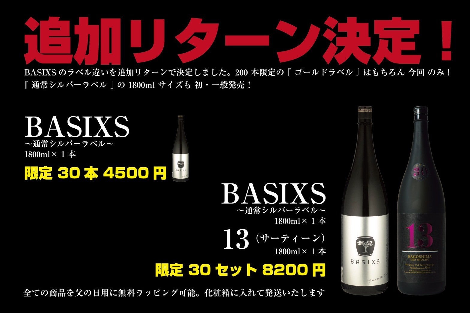 『BASIXS』1800mlの一般販売自体が初めてかつ、CAMPFIRE限定なので、ゴールド・シルバーの2色ラベルの『BASIXS』をGetできるのは今回のみ!
