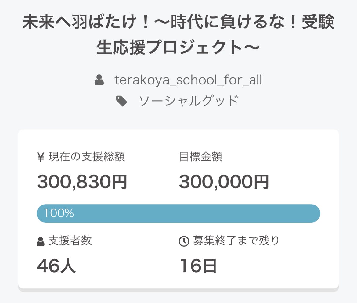 この度、関わって下さった方々、特に支援してくださった方々は、チームテラコヤとして、今後とも受験生を応援してくださると幸いです。