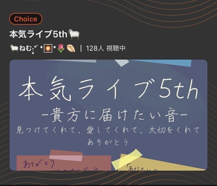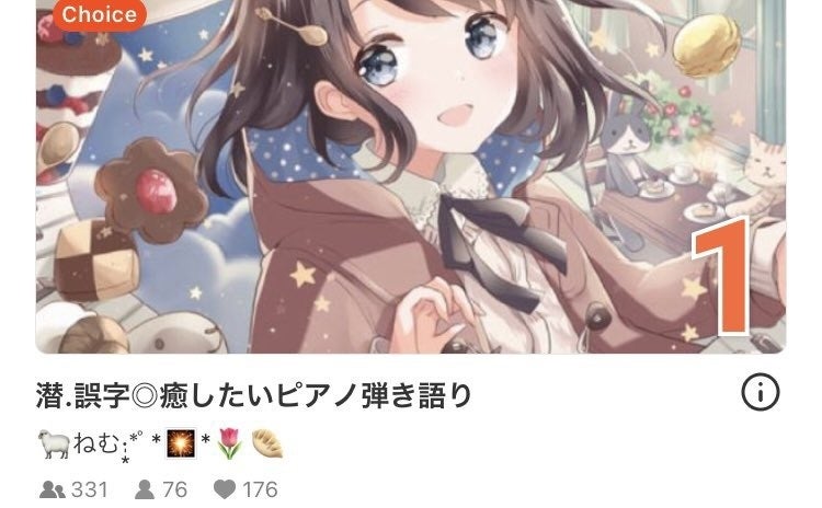 2020年8月24日〜10月5日、2020年11月6日〜現在(2021年5月31日)まで、運営のおすすめ配信者(Choice※)にも選ばれ、現在もほぼ毎日、ピアノ弾き語り配信を行っています。