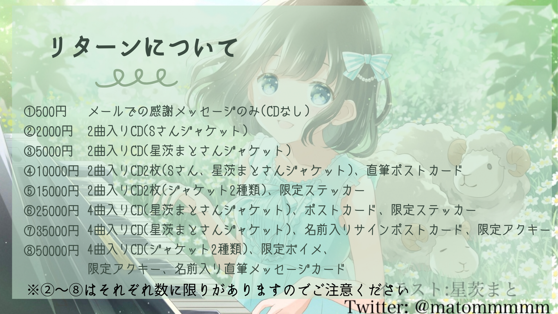 リターンは基本的にCDになります。CDジャケットは2種類あり、ウラガワ作詞者のSさんによるものと配信のイメージイラストも担当していただいている星茨まとさんによるものです。CD内容にも2種類あり、西川元さん制作音源のみの2曲が収録されているタイプとそれに加えてピアノ弾き語りバージョンが収録されているタイプがあります。ジャケットや収録内容によって支援額を設定させていただいております。