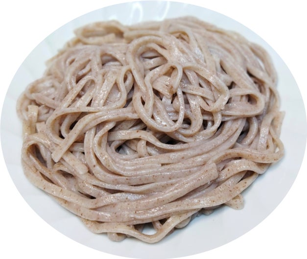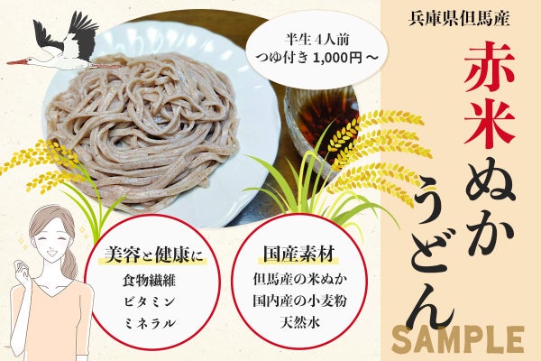 通常のうどんに「赤米の米ぬか」を加えました。小麦粉と米ぬかを混ぜて麺にしています。