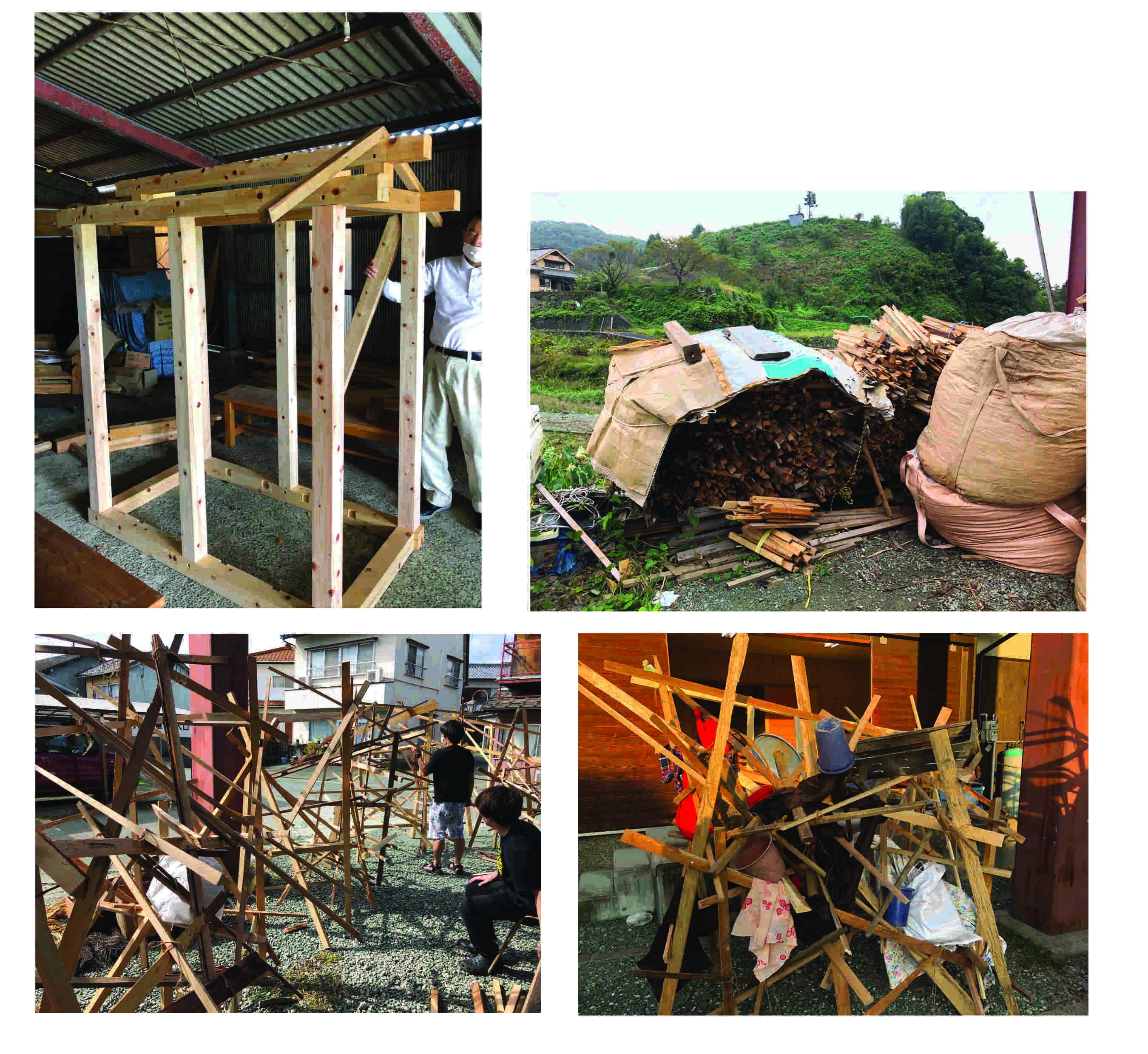 写真左下:いただいた端材をもとに、ぽこぽこクラブのメンバーで舞台美術制作。外での制作は通りかかる近所の人とお話をする有意義な時間。そして地元の小学生が学校終わりに遊びに来る場となりました。
