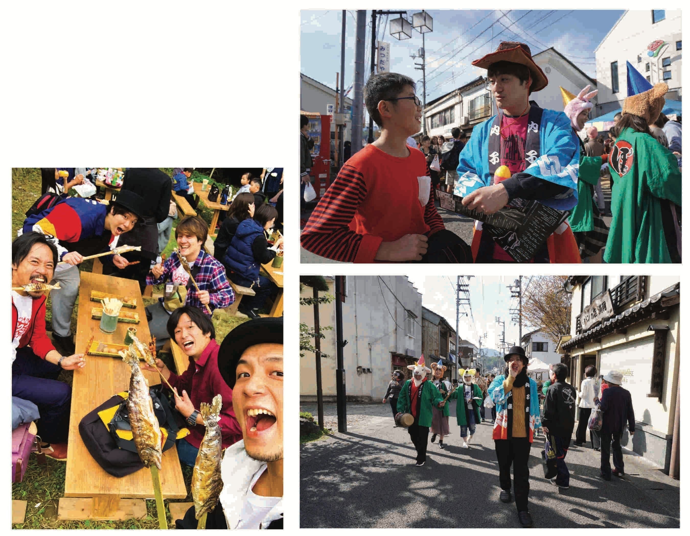 写真右上下:本番当日は内子町のお祭りもあり、ぽこぽこクラブも混じって最後の宣伝。