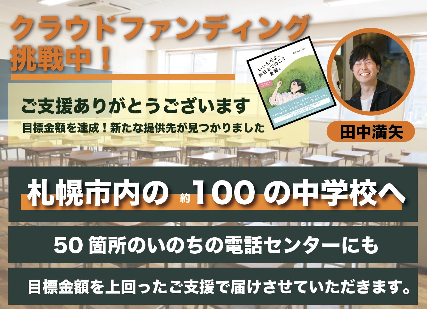 目標金額を越えた分のご支援は、ここにきてさらに広がった札幌市内100の中学校へ、
