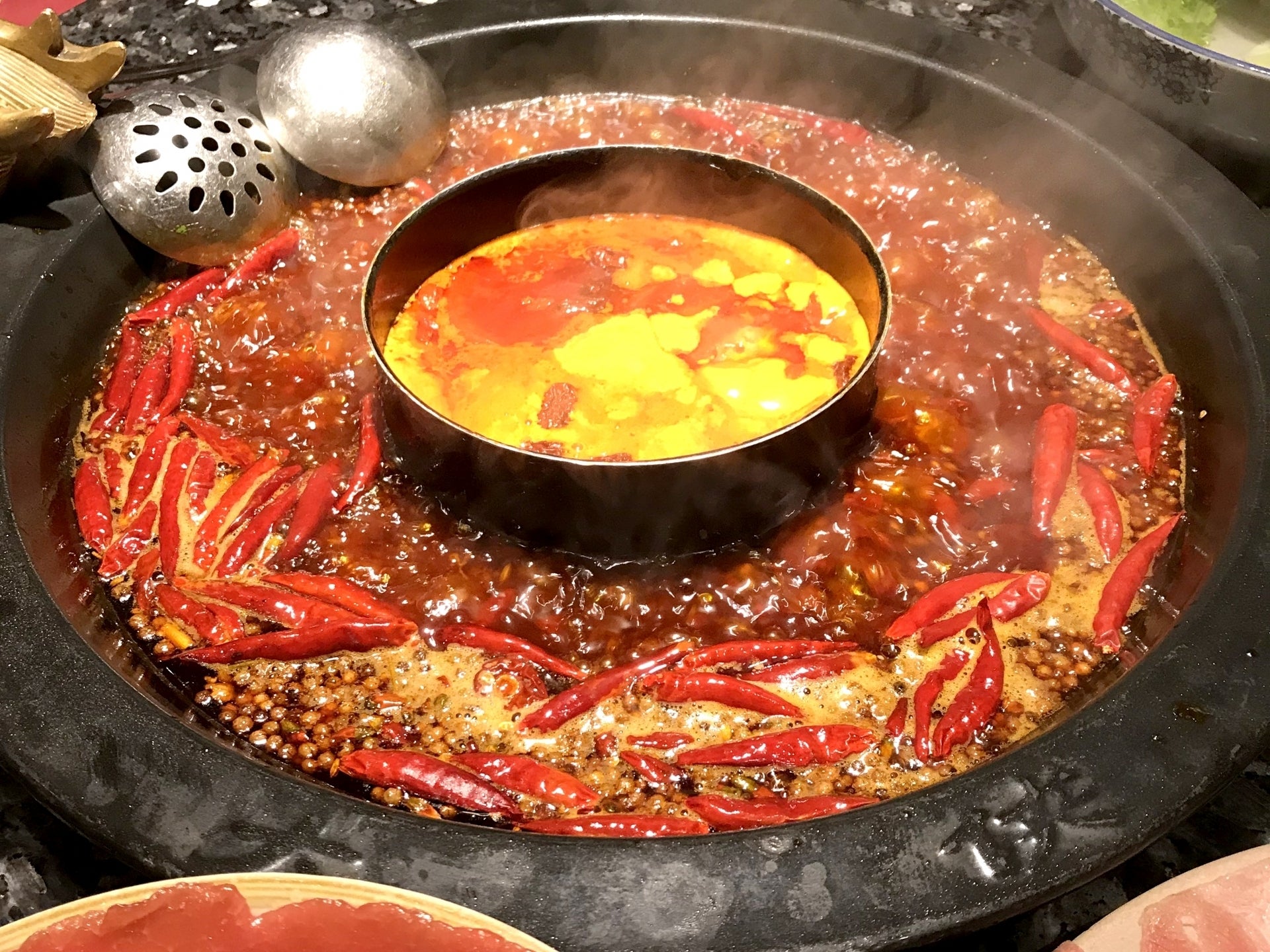 四川料理の火鍋は20種類以上の漢方、香辛料を油で煮込み辛味のある香辛オイルを作ります。